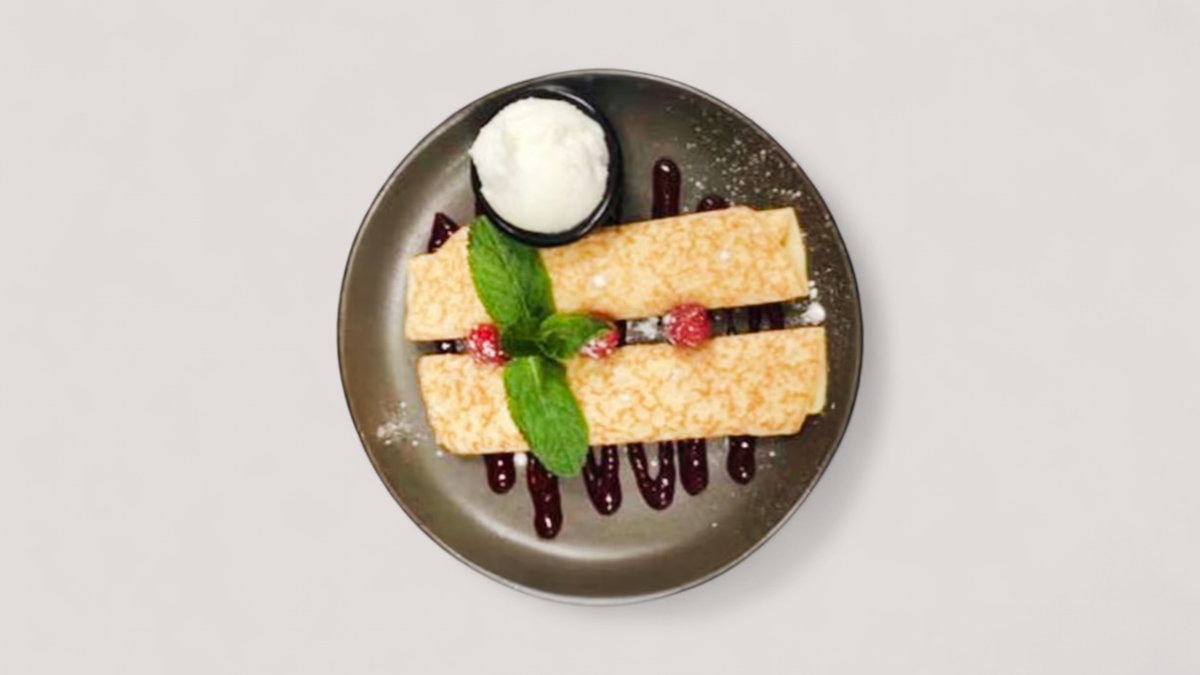 Tallerken med røræg, bacon, brunchpølser, letrøget skinke, chorizo, gouda, brieost, yoghurt med müsli, frisk frugt samt pandekage med sirup, nutella, syltetøj og røget laks. Serveres med en kop kaffe.