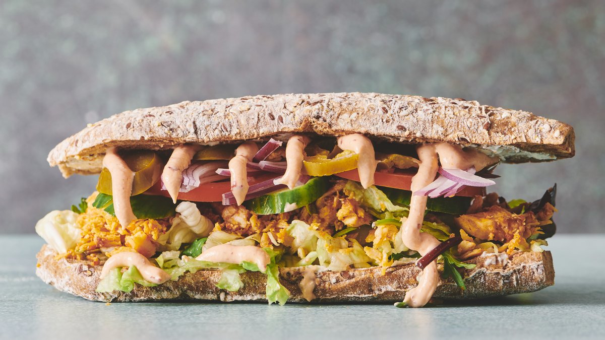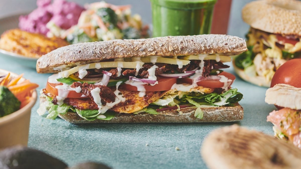 Sandwichbrød med fyld af krydrede kyllingestrimler, salat, tomat, agurk, rødløg, jalapeños og chilimayo-dressing.