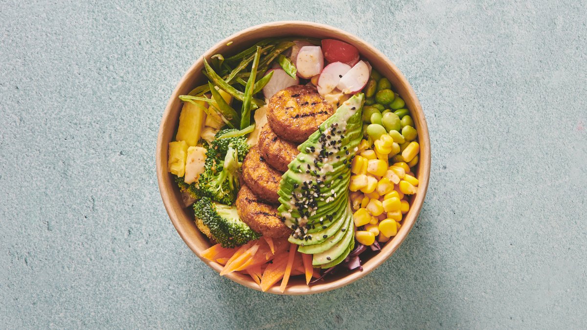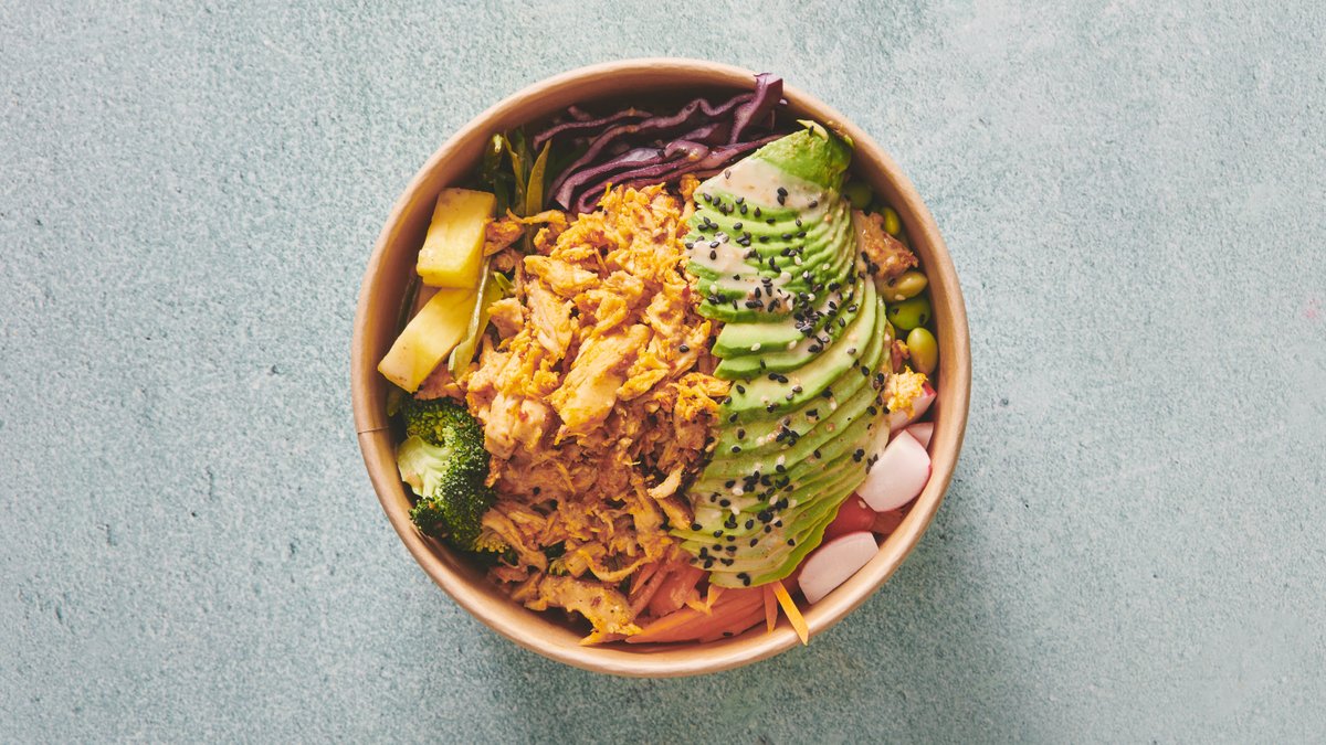 Kyllinge bowl serveret med en valgfri dåsesodavand.