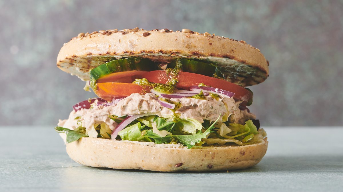 Valgfri bagel brød med fyld af hjemmelavet tunmousse, salat, tomat, agurk, rødløg og pestodressing.