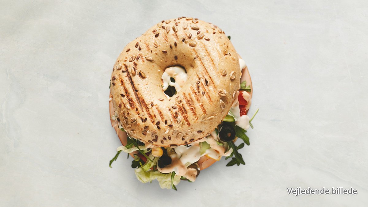 Valgfri bagel brød med fyld af krydrede kyllingestrimler, salat, tomat, agurk, rødløg, jalapeños og chilimayo-dressing.