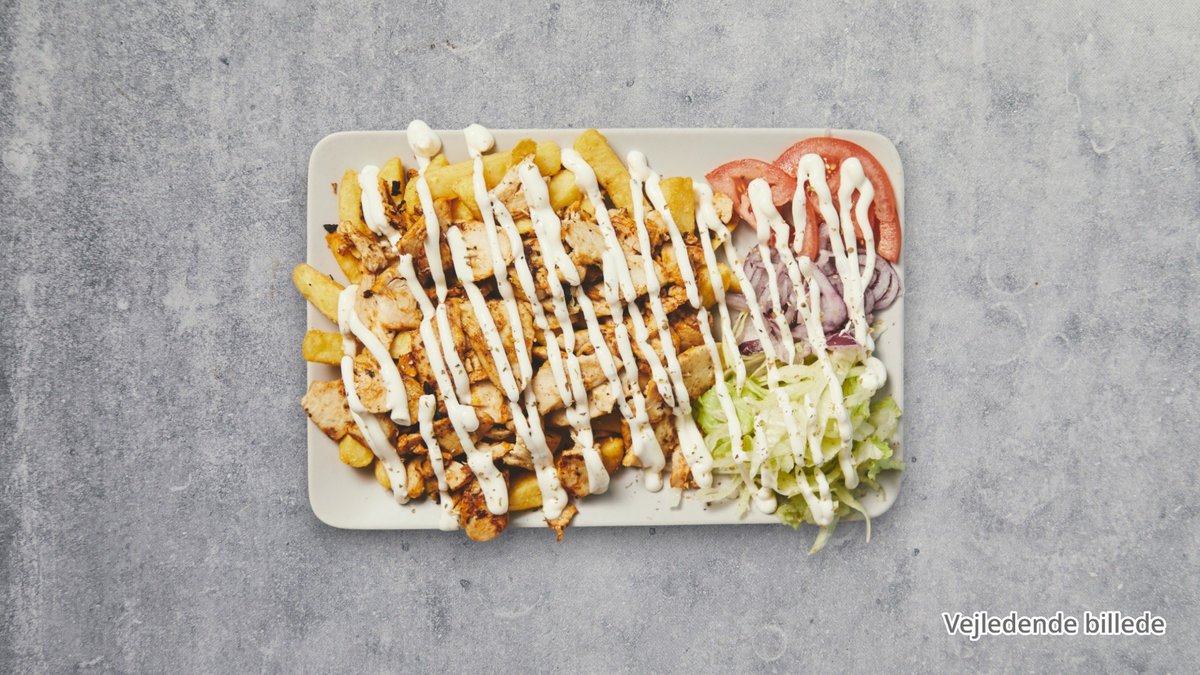 Kebab, pommes frites og dressing.