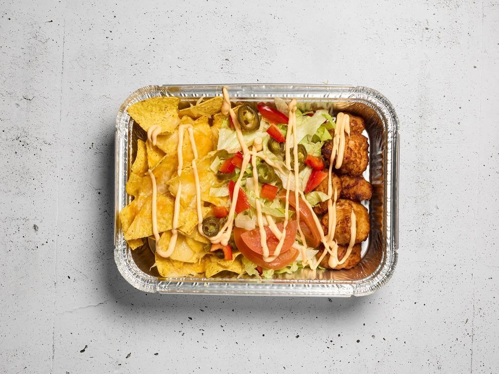 Sprøde tortilla chips toppet med smeltet ost, jalapeños, kyllingekebab og dressing.