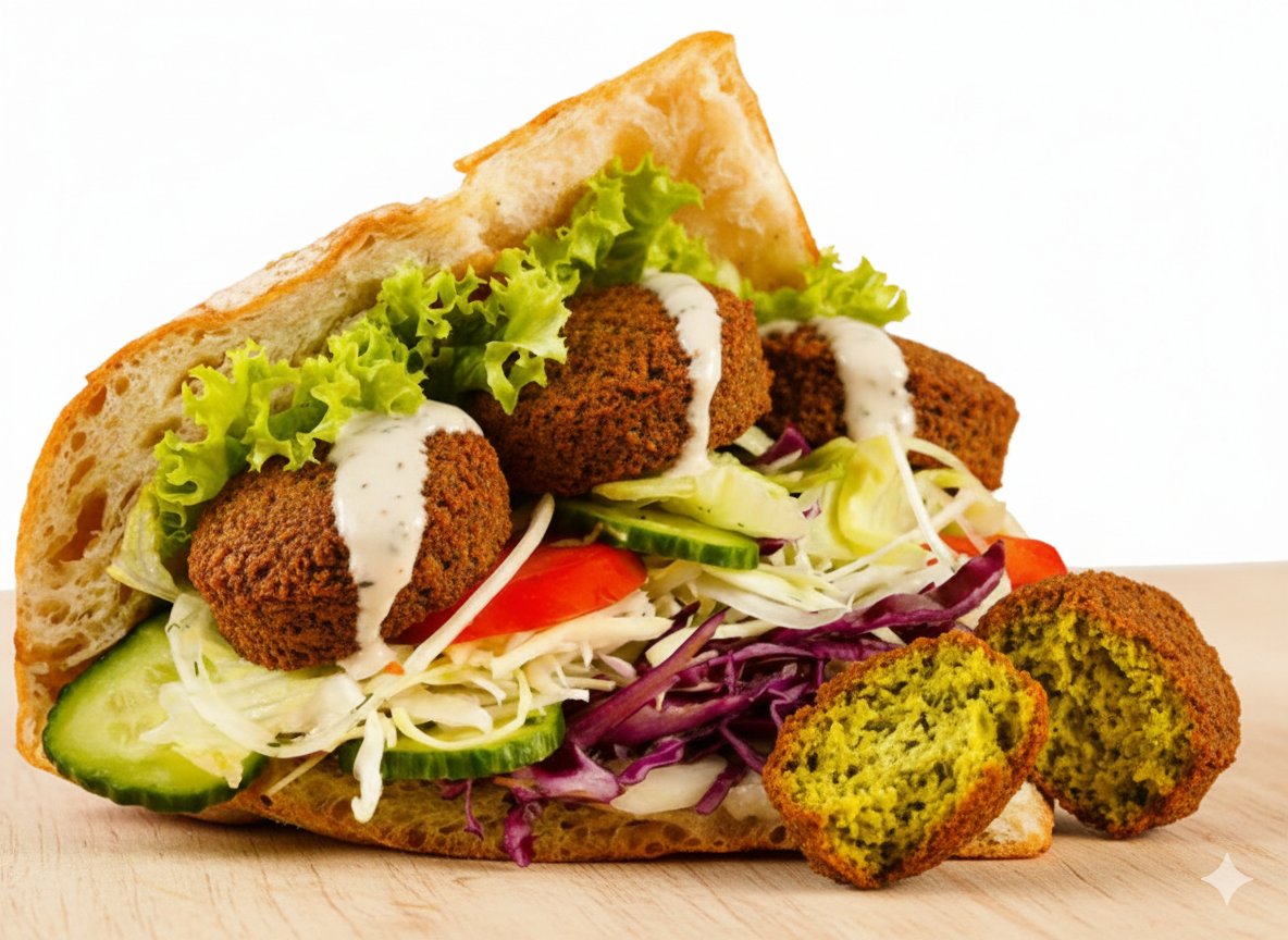 Fladbrød med fyld af falafel, friske grøntsager og dressing.