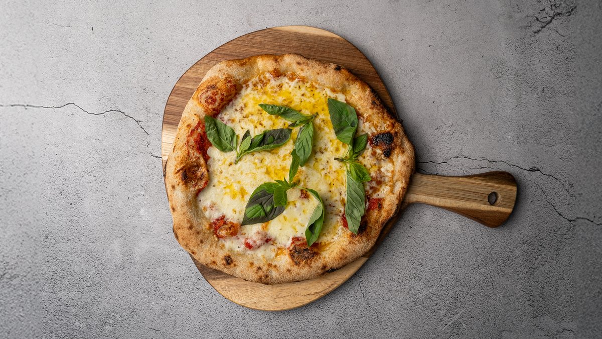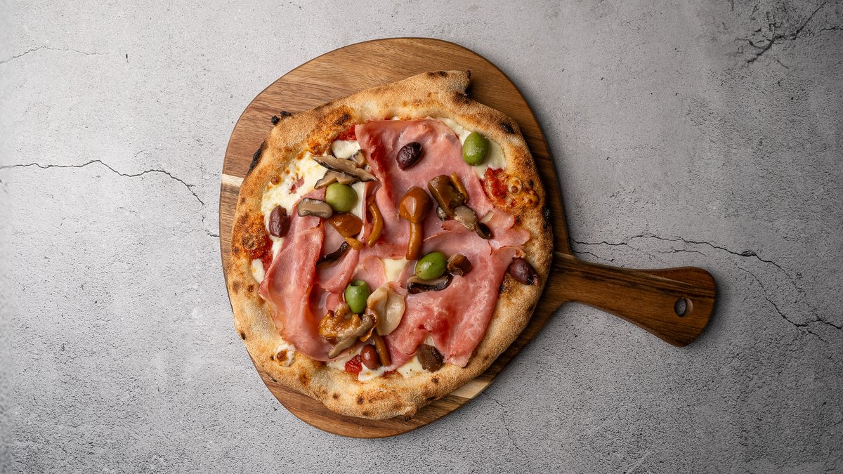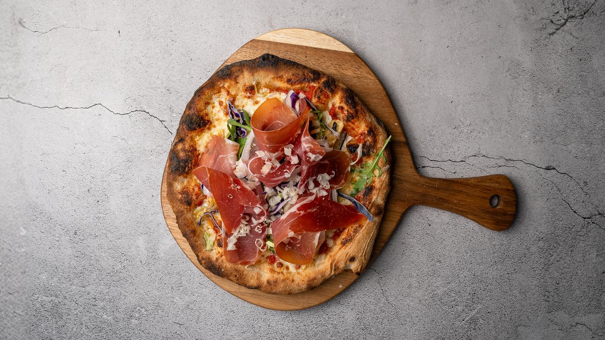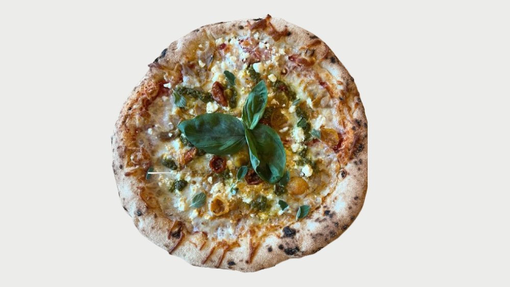 Alle pizzaer er lavet på en surdejsbund, som har hævet i op til 72 timer. En rigtig kvalitetsoplevelse. V - Vegetarisk