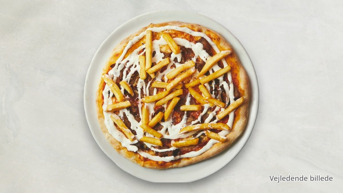 Tomatsauce, ost, kebab, pepperoni, pommes frites og dressing.