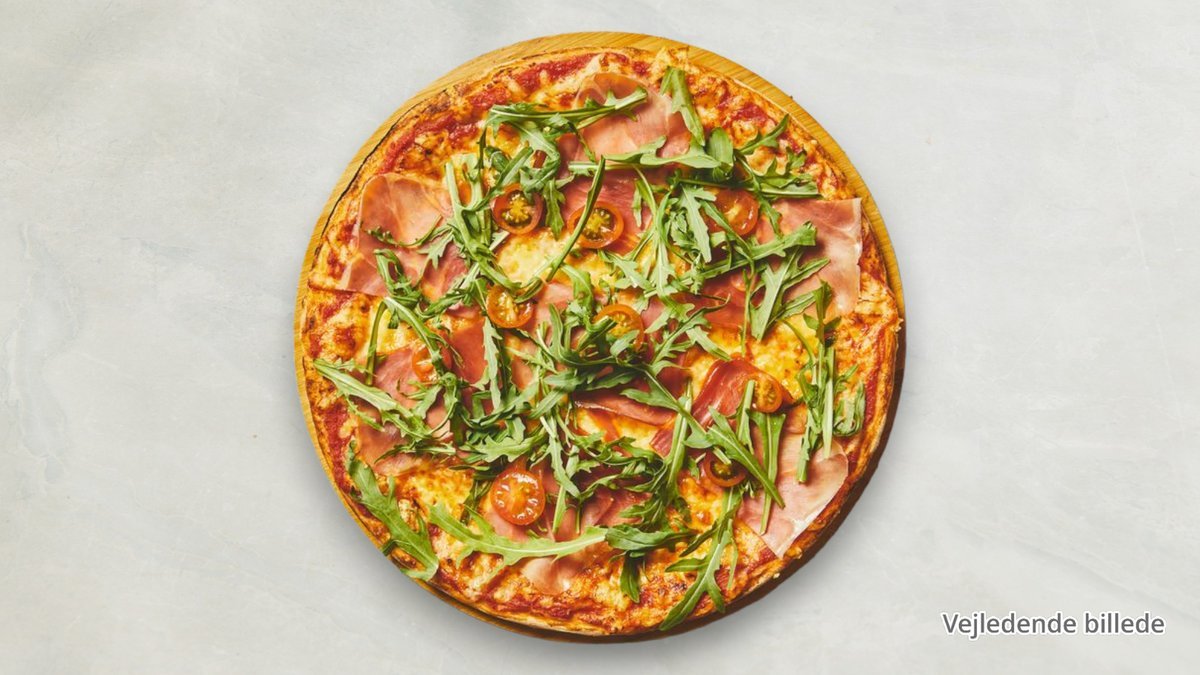 Tomatsauce, ost, serrano skinke, rødløg, rucola, cherrytomater og parmasanost.