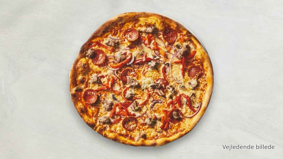 Tomatsauce, ost, hakket oksekød, pepperoni, løg, skinke, paprika og champignon.