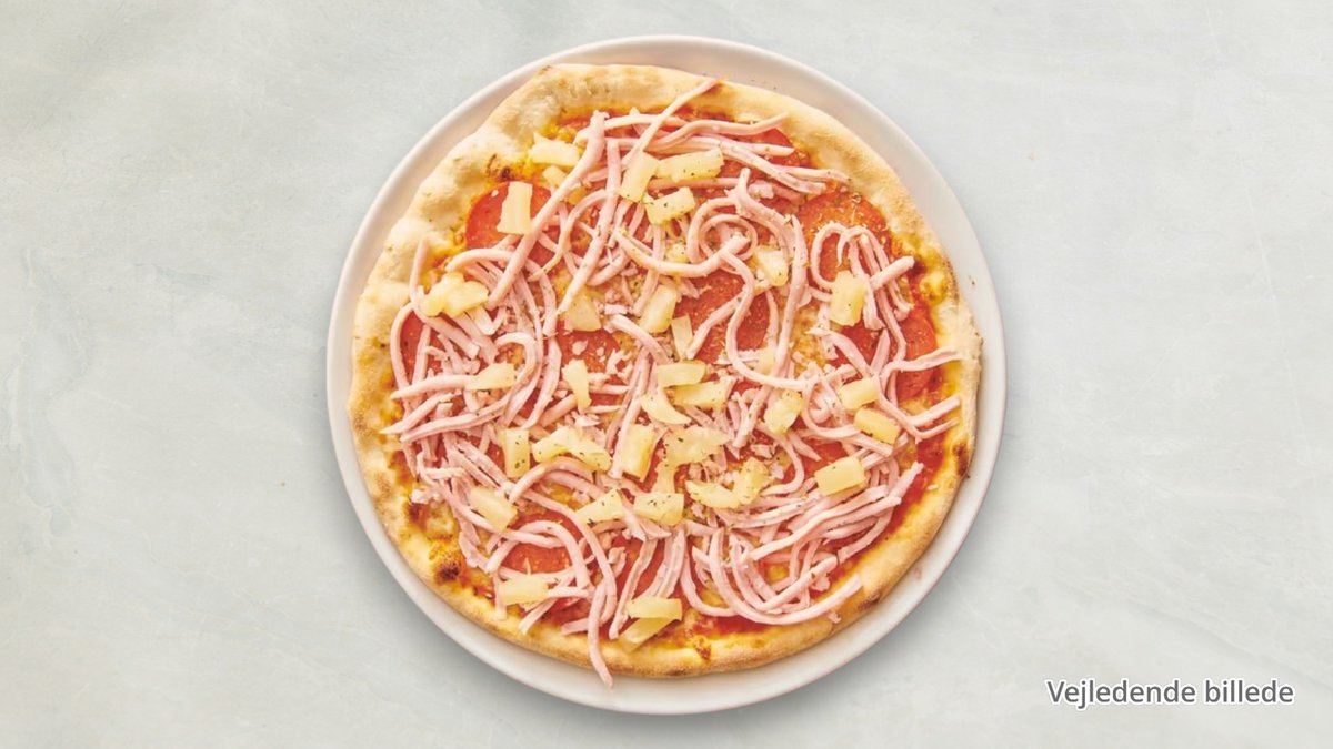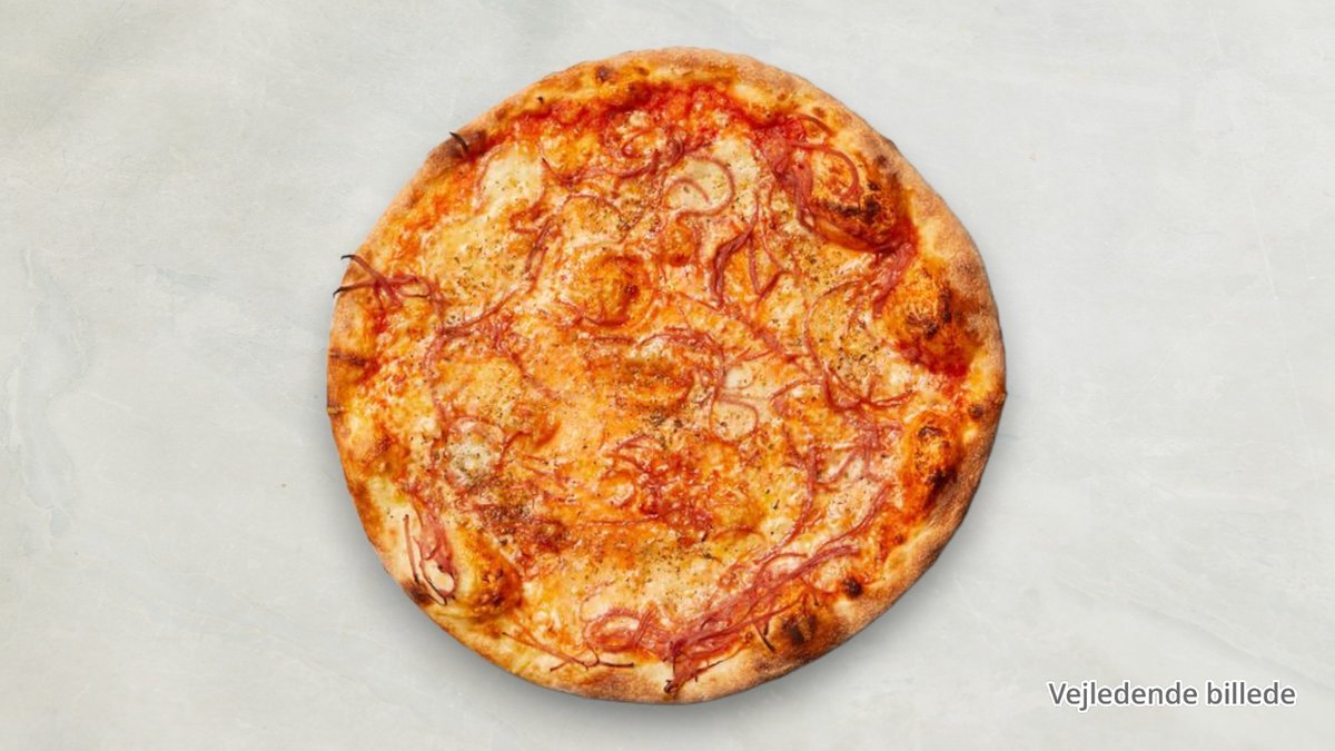 Tomatsauce, ost, skinke, cocktailpølser og pepperoni.