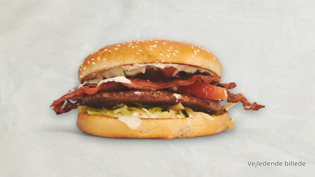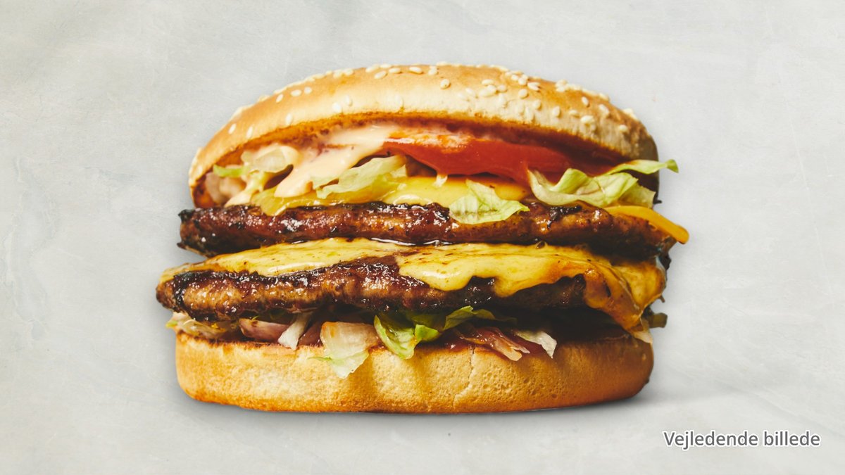 To oksekødsbøffer i burgerbolle med fyld af ost, salat, tomat, agurk, ketchup og burgerdressing.