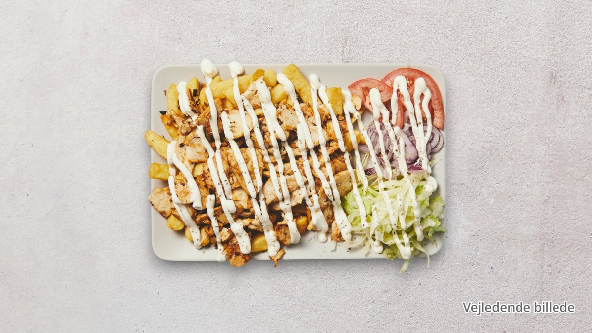 Tomatsauce, ost, kebab, pommes frites og dressing.