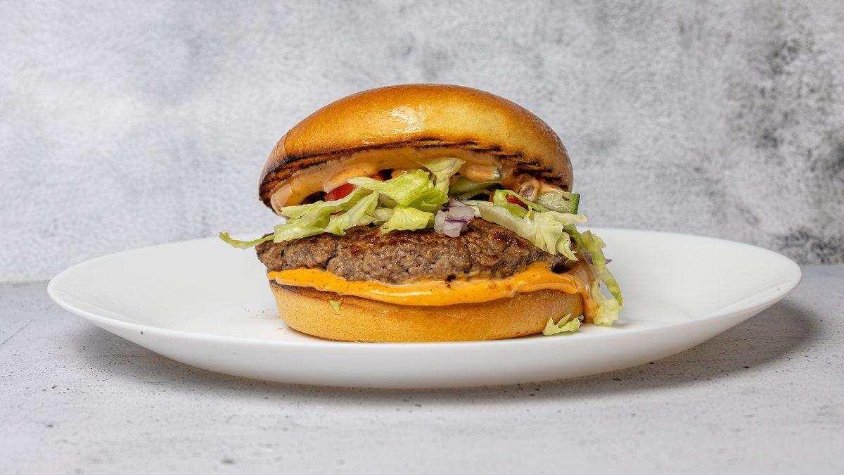 Briochebolle med fyld af bøf, ost, salat, tomat, agurk, løg, chilimayo og burgerdressing.