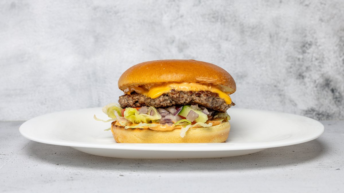 Briochebolle med fyld af bøf, 2x ost, salat, tomat, agurk, løg, chilimayo og burgerdressing.