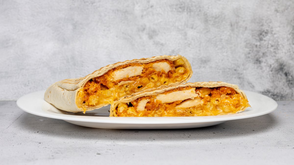 Wrap med fyld af krydret kylling, pommes frites, blandet ost, chilimayo og mayonnaise.