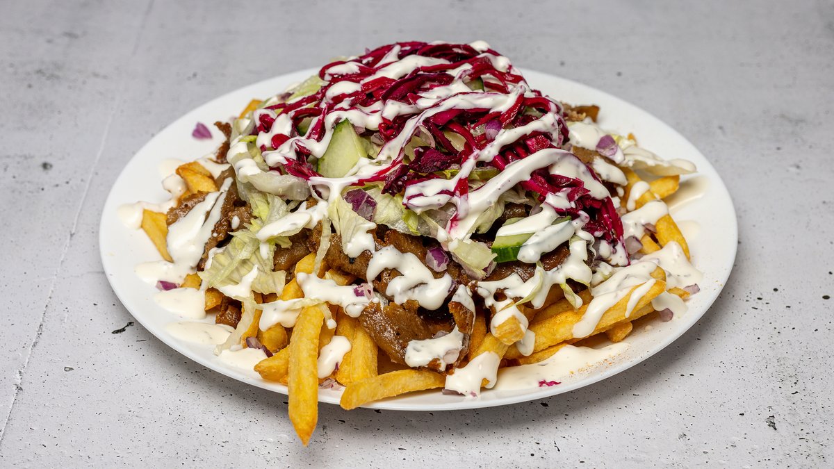 Fladbrød med fyld af kebab. salat, tomat, agurk, løg, rødkål, chili og cremefraiche dressing.