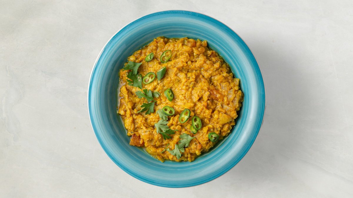 Gule linser kogt med spidskommen, hvidløg og karrysauce. Serveres med ris.