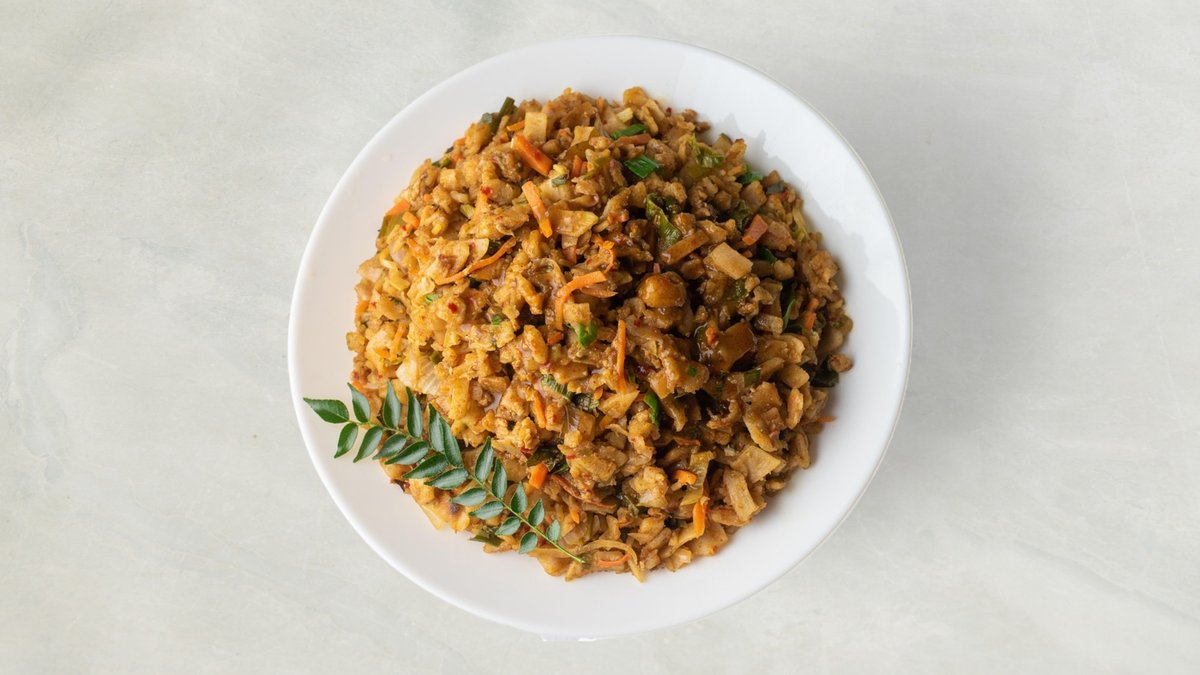 Hakket roti stegt med kylling, æg, løg, porre, gulerod og krydderier.