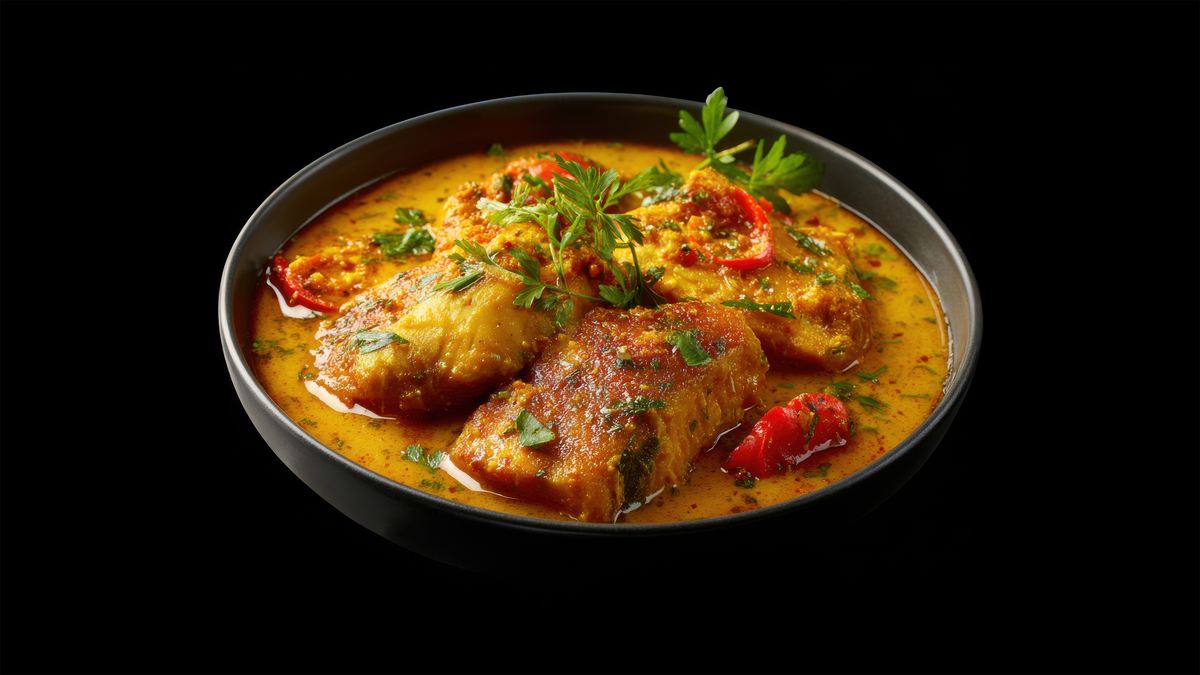Karry med fisk og blandt indiske kydderi, serveres med ris og raita ves siden af.