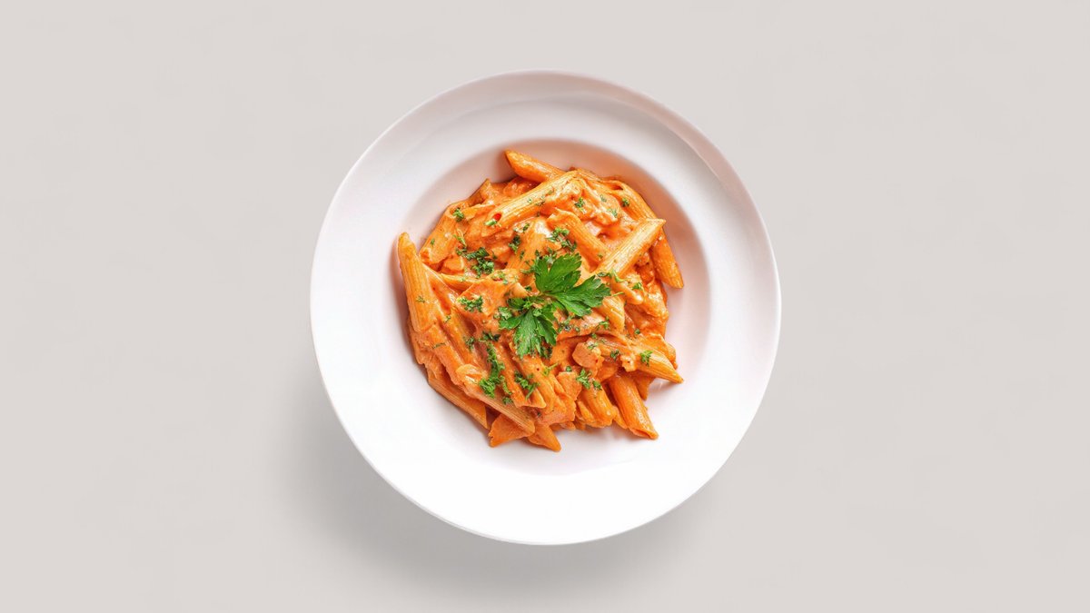 Pasta vendt i royalsovs med peberfrugt og kylling toppet med cheddarost.