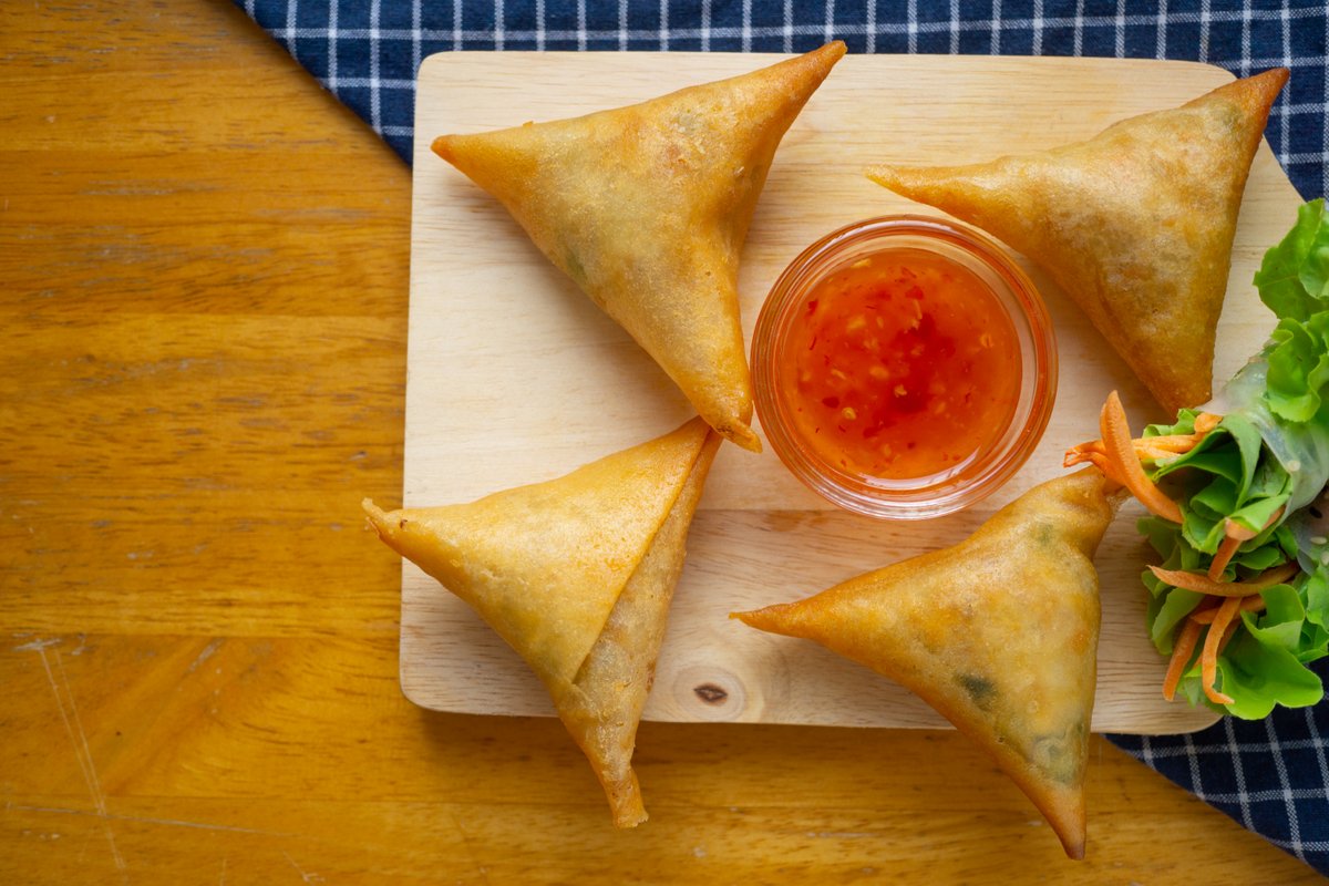 Samosa med fyld af grøntsager. Serveres med sursød sovs.