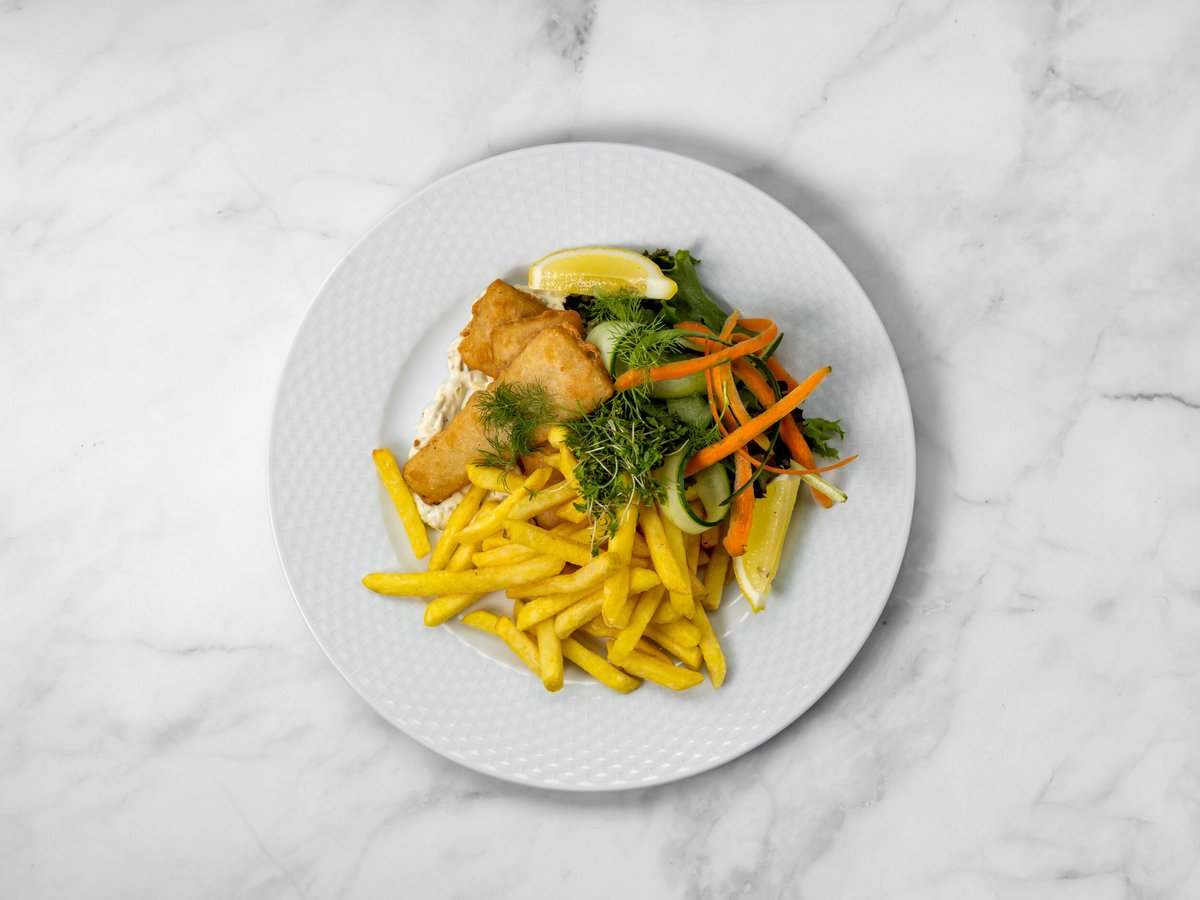 2 stk fiskefileter Serveres med pommes frites, salat, dressing, ketchup og remoulade.