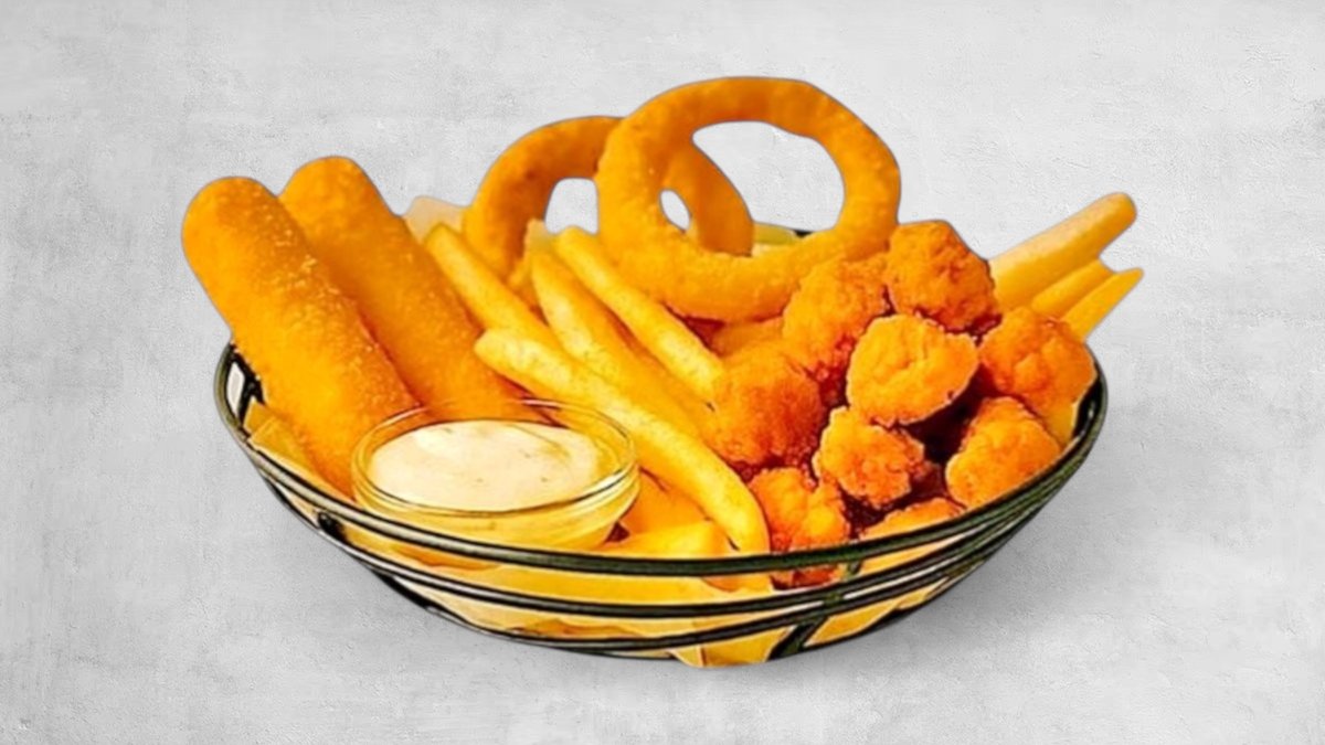 2 Mozzarella sticks, 2 Løgringe, 4 Kyllingepopcorn, Pommes frites og Dip