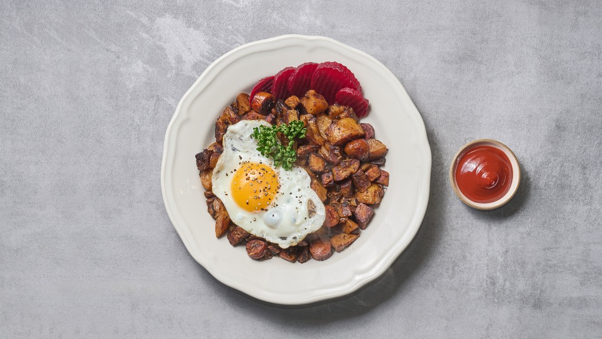 Flæskesteg og pølser med stegte løg, kartofler, rødbeder, persille, ketchup og spejlæg.