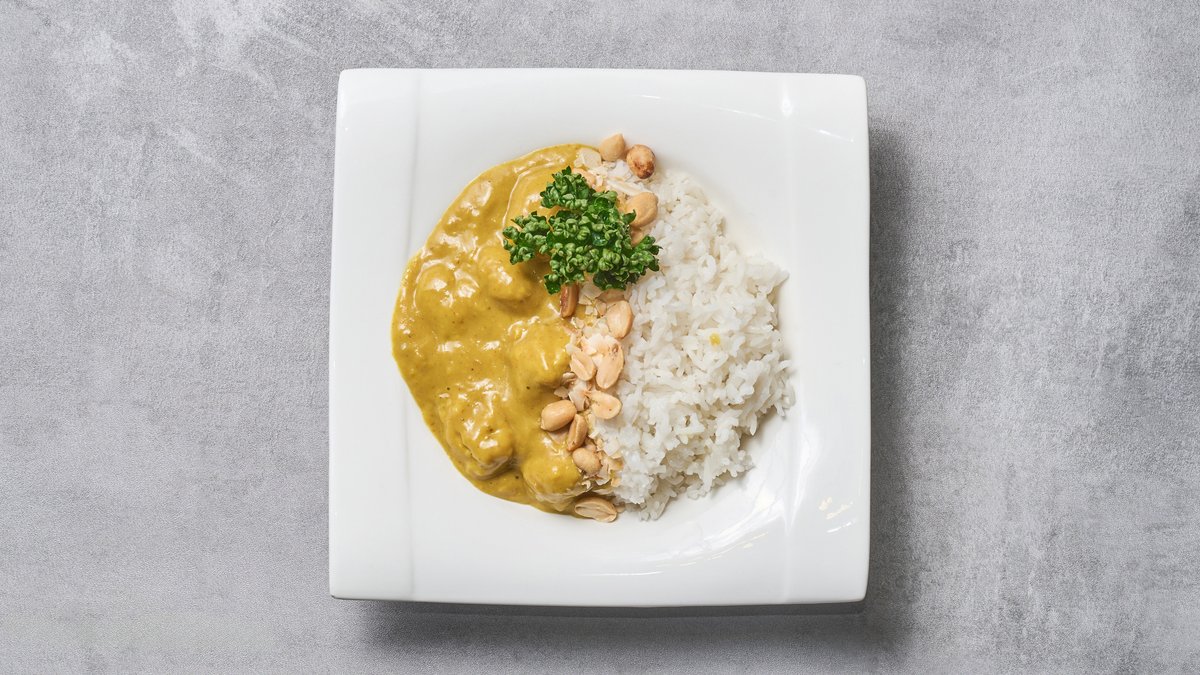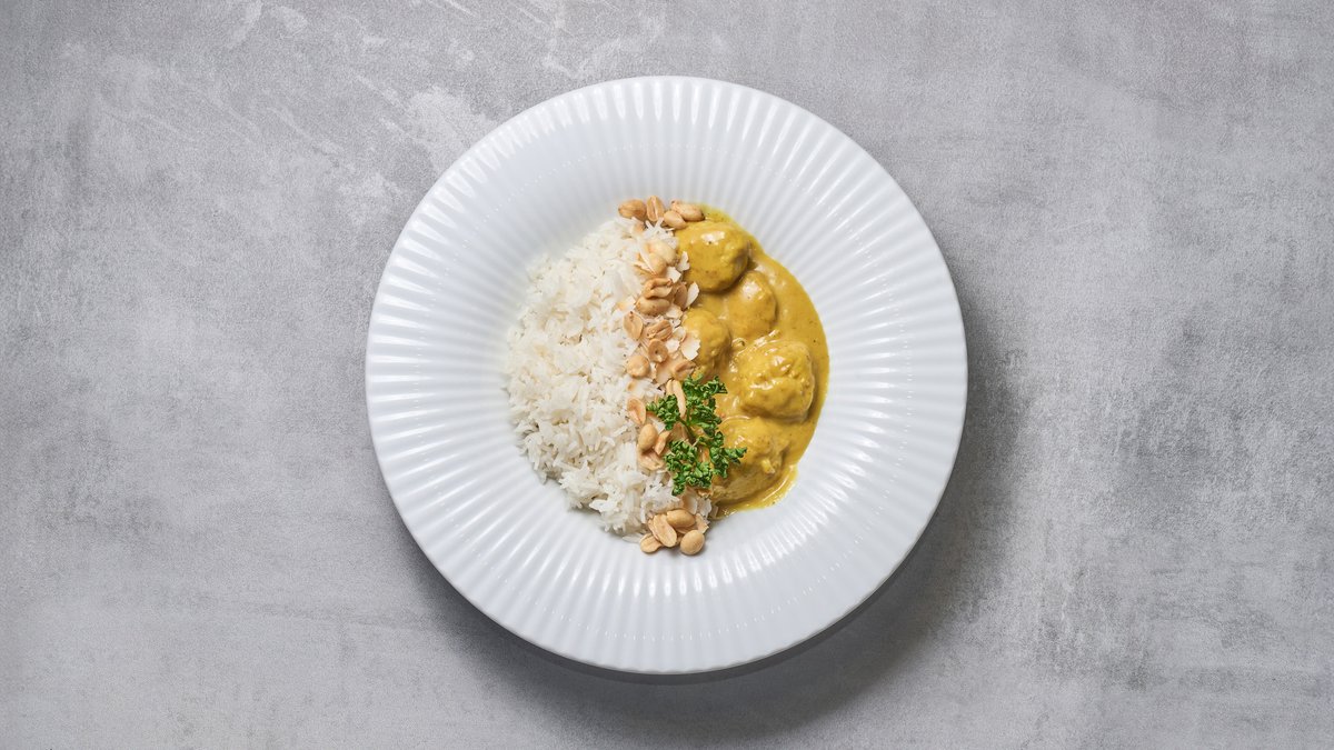 Kyllingboller vendt i flødesauce, karry, persille, peanuts, kokosflager og ris.