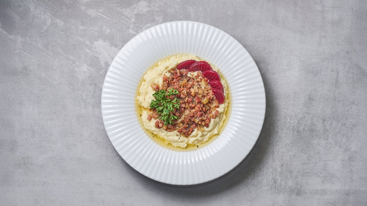 Kartoffelmos med bacon i tern , stegte løg, rødbeder og persille.