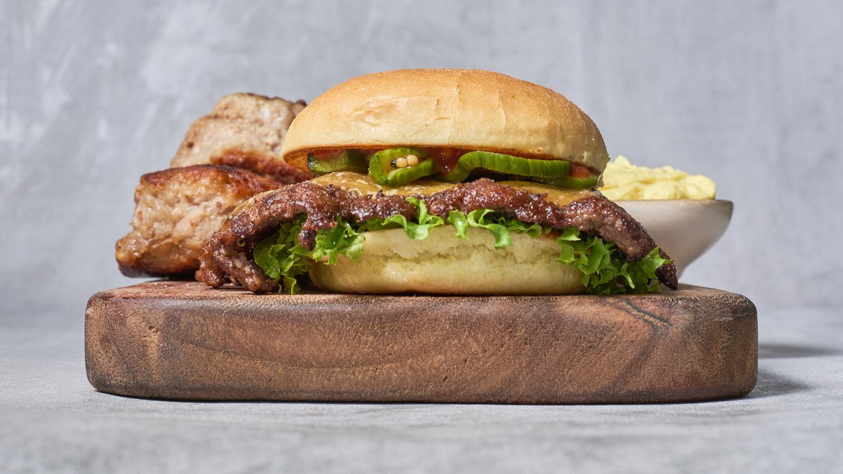 Briochebolle med fyld af chilimayo, salat, tomat, bøf, cheddar og hibiscus syltede rødløg. Serveres med pommes frites, dyppelse og en valgfri sodavand.