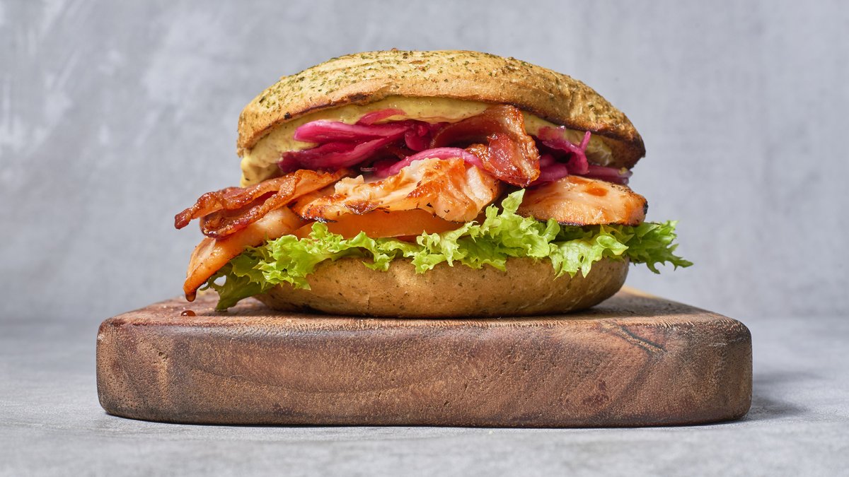 Sandwich med fyld af karrydressing, salat, tomat, kylling, bacon og hibiscus syltede rødløg. Serveres med pommes frites, dyppelse og en valgfri sodavand.