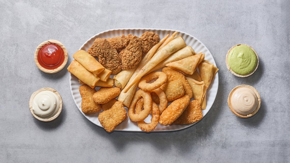2 x Nuggets 2 x Løgringe 2 x Chicken strips 2 xForårsruller 2 x Samosa 2 x Reje twister 2 x Cheddar jalapeños og 2 valgfrie dips.