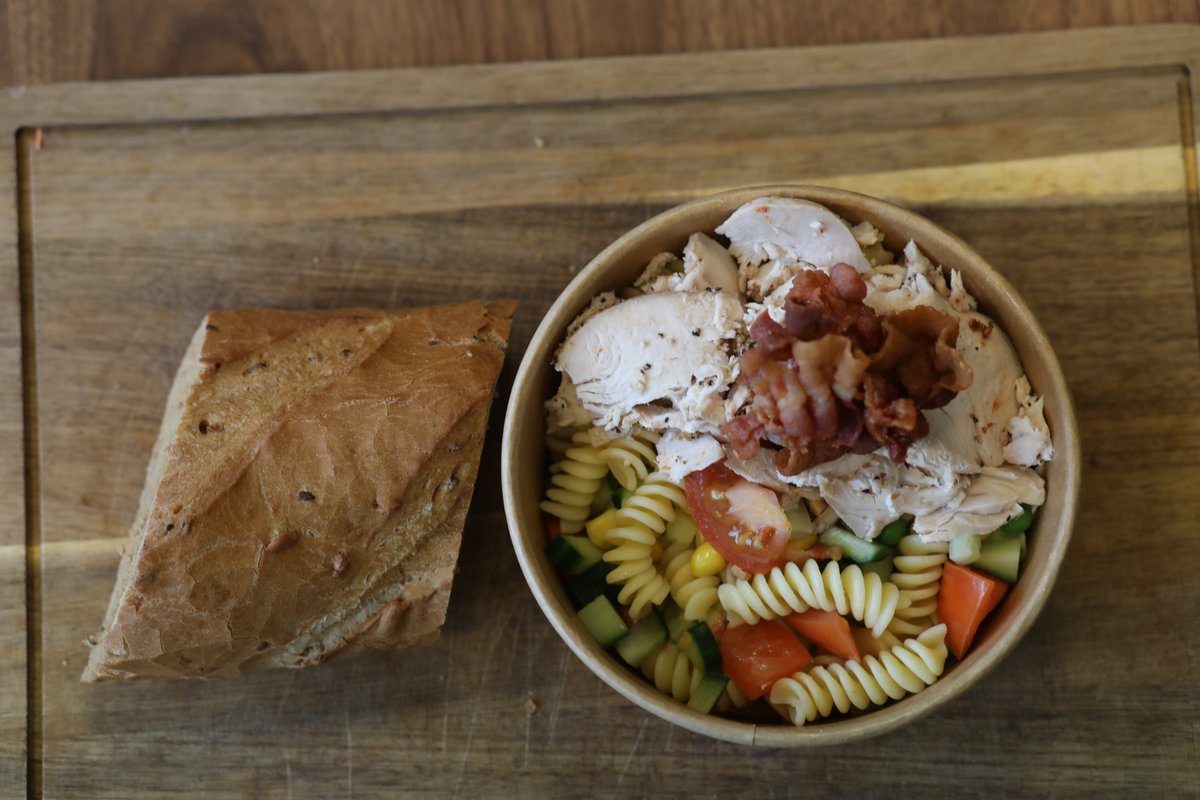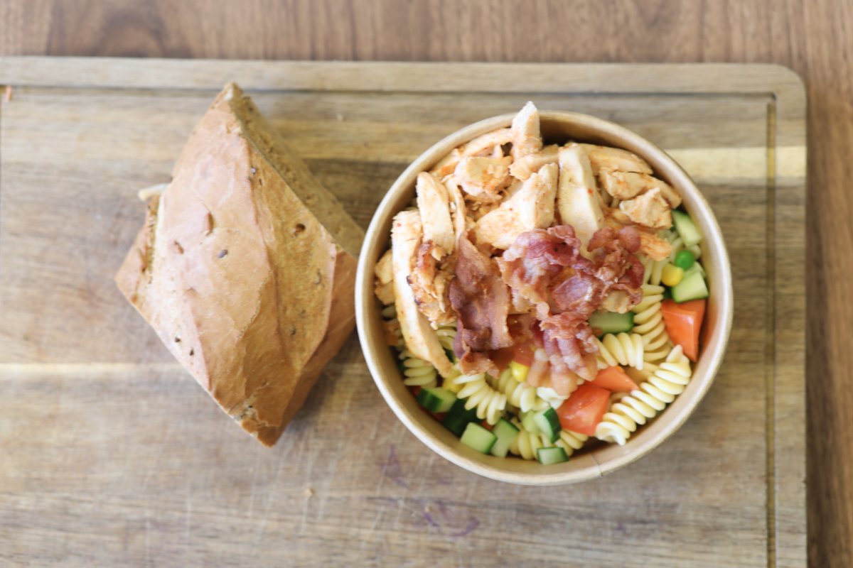 Pastaskruer, sprøde ærter, søde majs, agurk, saftig tomat, kylling, bacon og valgfri dressing. Serveres med valgfrit brød.