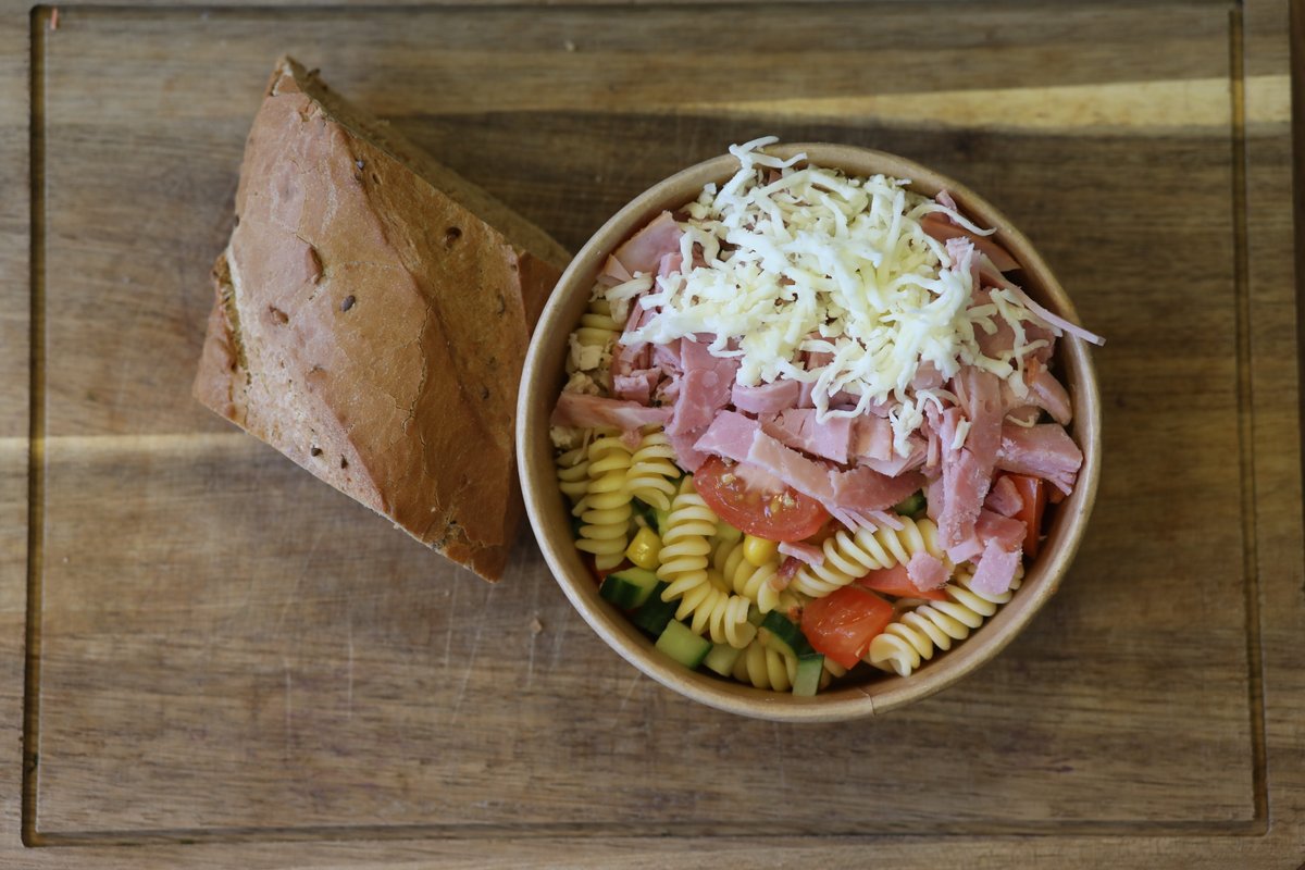 Pastaskruer, sprøde ærter, søde majs, agurk, saftig tomat, ost, skinke og valgfri dressing. Serveres med valgfrit brød.