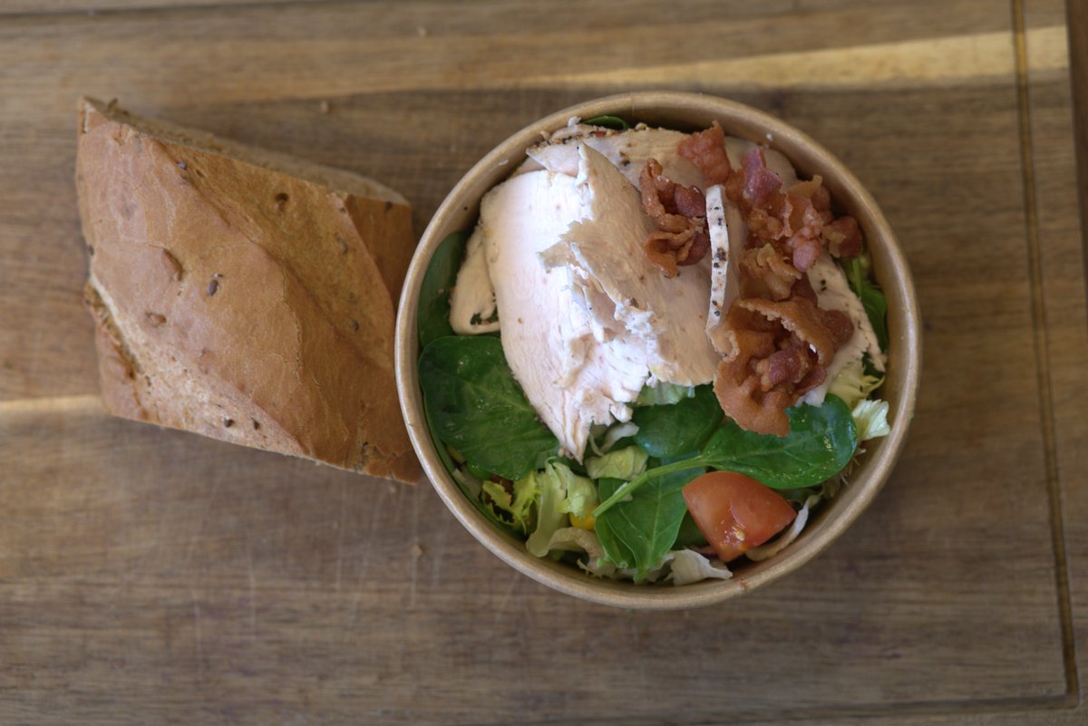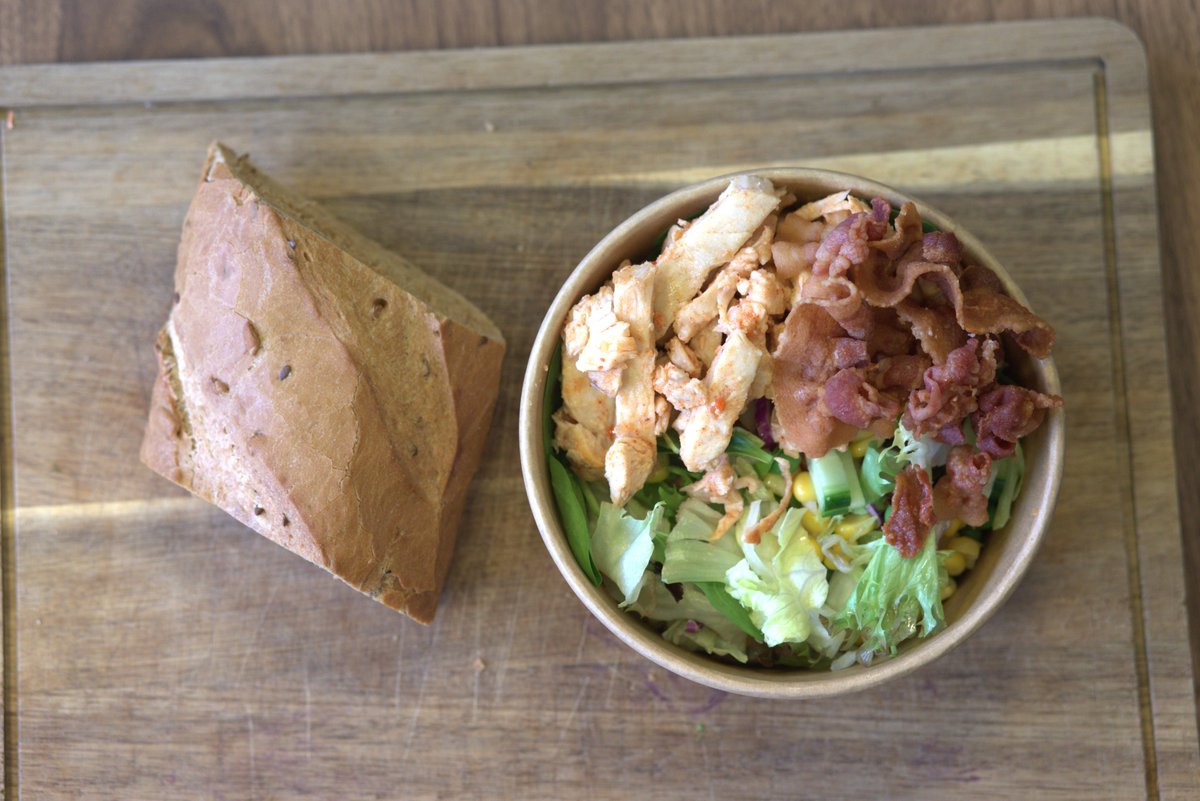 Iceberg, sprøde ærter, søde majs, agurk, saftig tomat, kylling, bacon og valgfri dressing. Serveres med valgfrit brød.