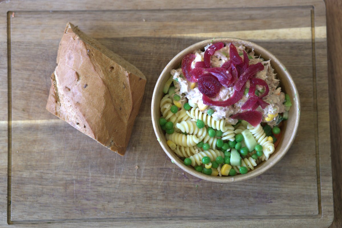 Pastaskruer, sprøde ærter, søde majs, agurk, saftig tomat, tunmousse og valgfri dressing. Serveres med valgfrit brød.