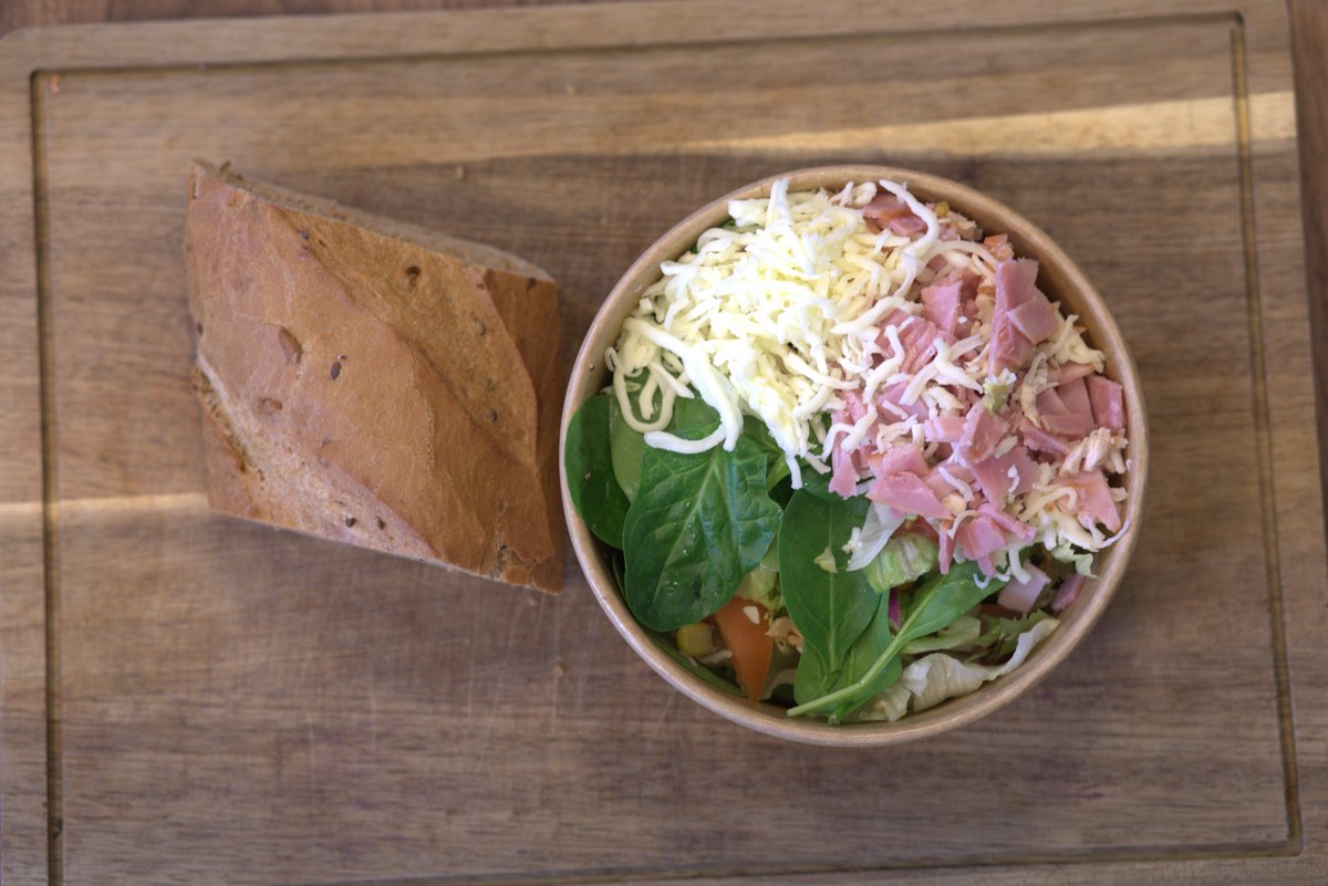 Iceberg, sprøde ærter, søde majs, agurk, saftig tomat, ost, skinke og valgfri dressing. Serveres med valgfrit brød.