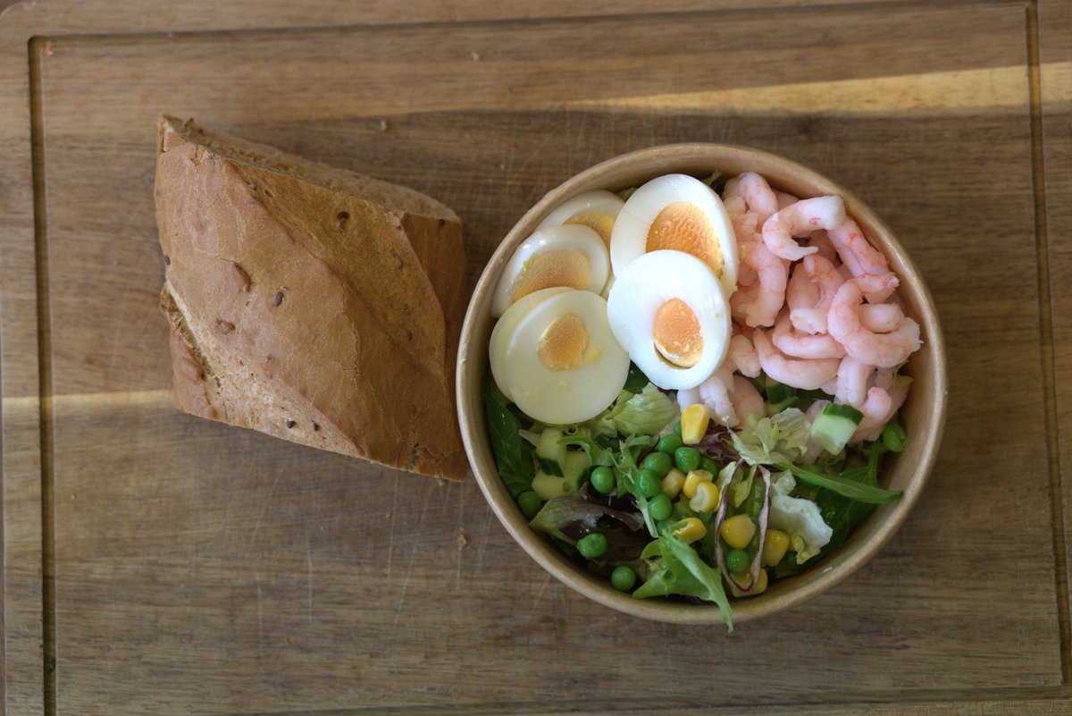 Iceberg, sprøde ærter, søde majs, agurk, saftig tomat, æg, rejer og valgfri dressing. Serveres med valgfrit brød.