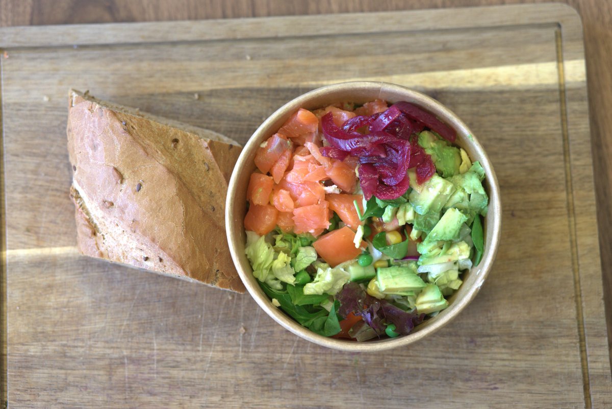 Iceberg, sprøde ærter, søde majs, agurk, saftig tomat, laks, avocado og valgfri dressing. Serveres med valgfrit brød.