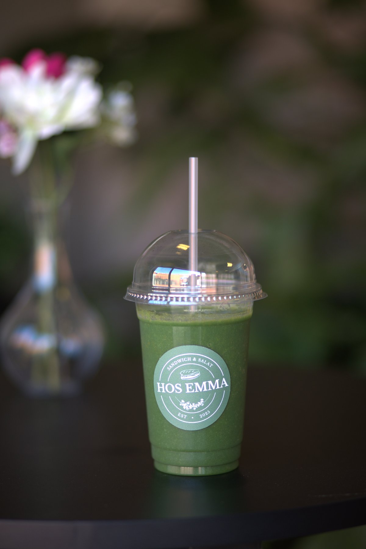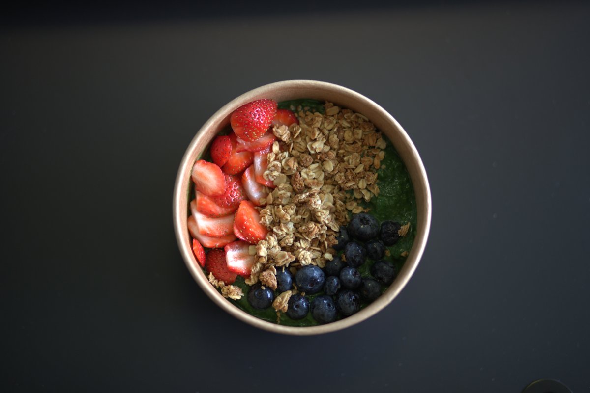 Spinat, broccoli, mango, avocado, hvedegræs, byg og spirulina. Vælg selv hvad bowlen skal blendes med.