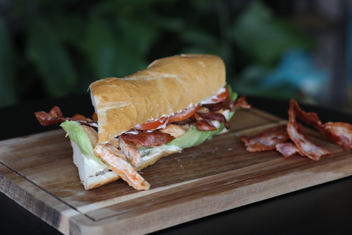 Valgfrit brød med fyld af kylling, sprødt bacon, friske tomater, frisk salat og valgfri dressing.