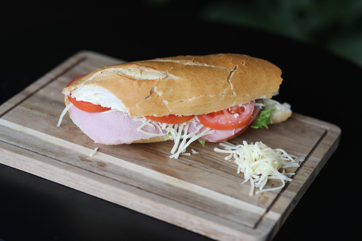 Valgfrit brød med fyld af ost, skinke, friske tomater, frisk salat og valgfri dressing.