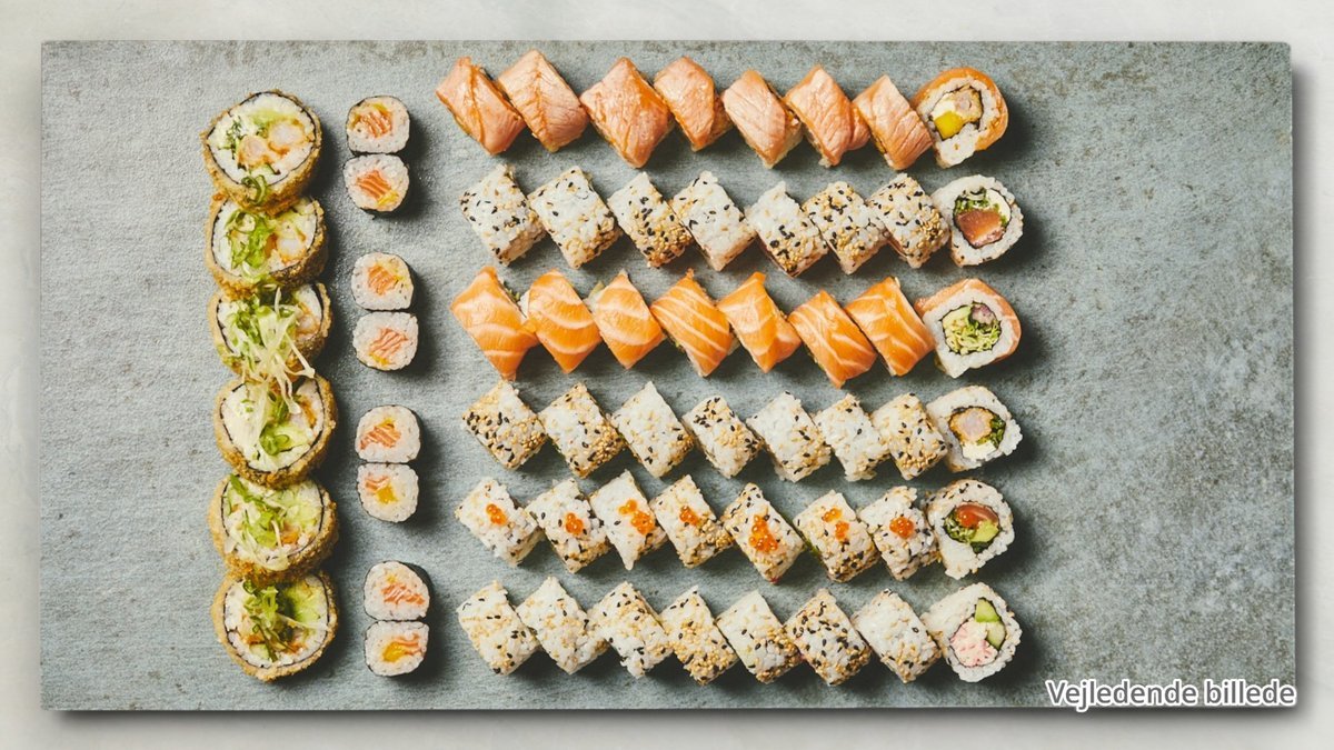 Nigiri 5 x Laks med hvidløg 5 x Spicy tun Uramaki 8 x California 8 x Crispy Ebi 8 x Spicy tun Kaburimaki 8 x Hvidløg Ebi 8 x New York 8 x Hjemme Roll.