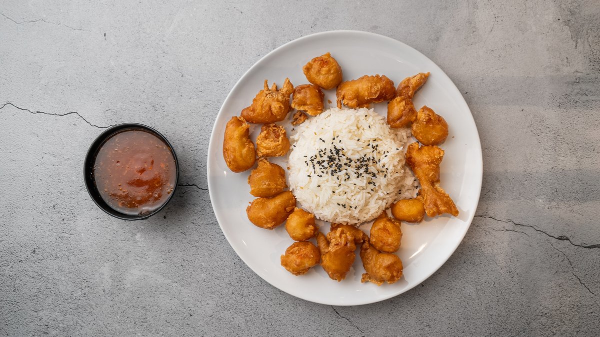 Små dybstegte rejer serveres med sur-sød sauce og ris.