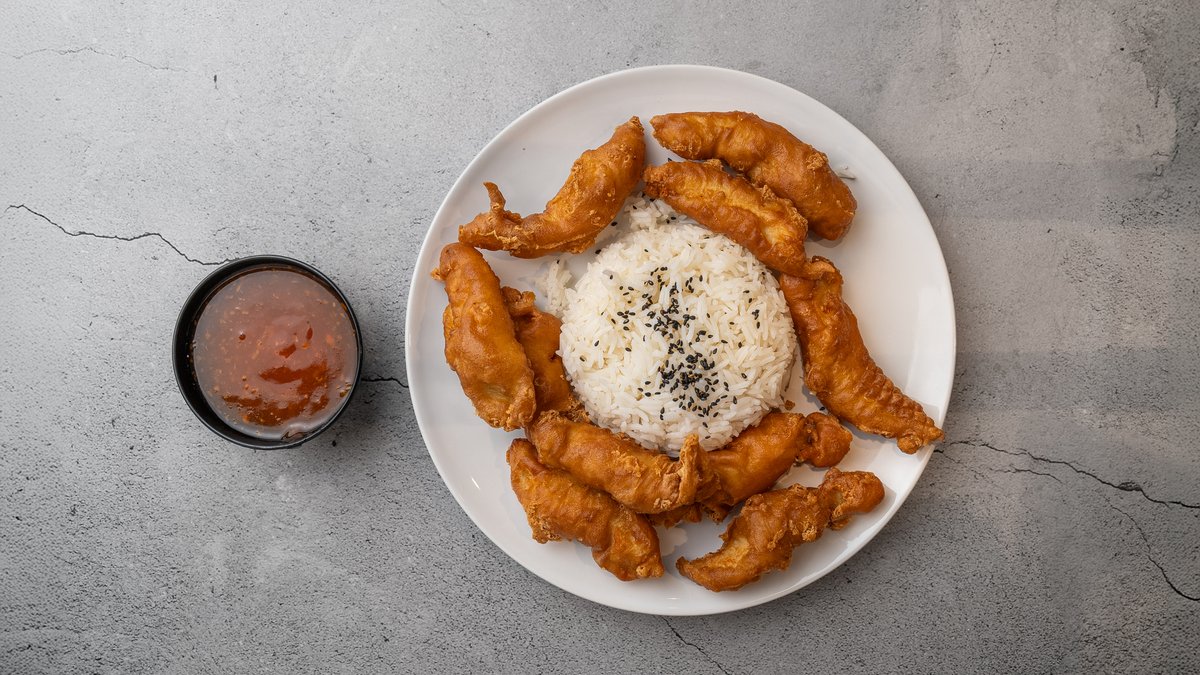 Dybstegt kylling i sur-sød sauce. Serveres med ris.