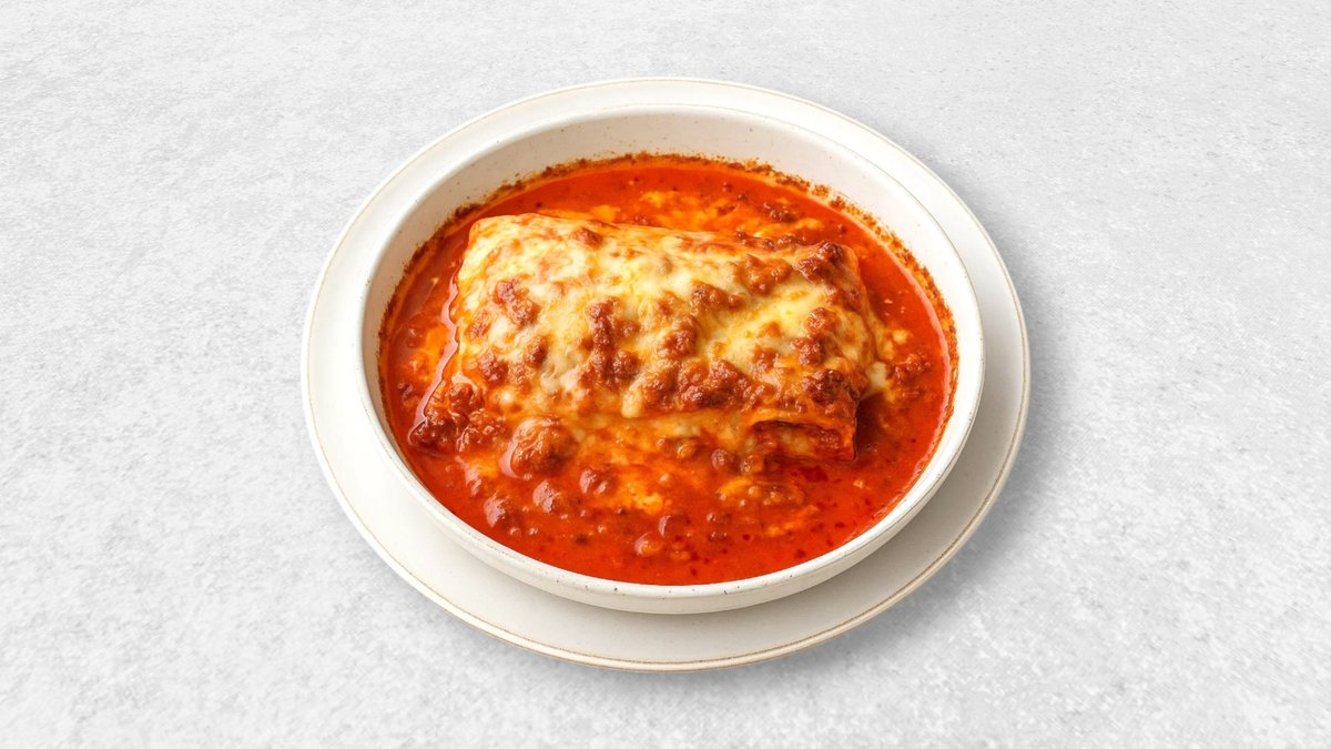 Indbagt pizza med spaghetti og kødsovs.