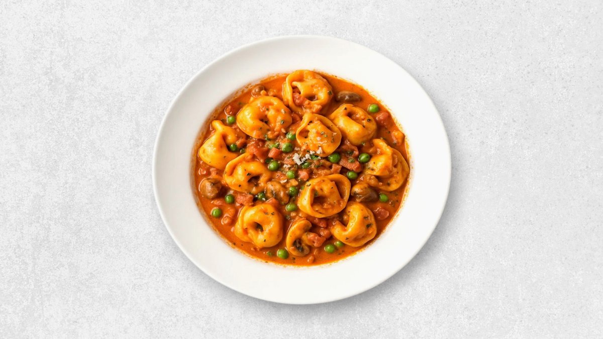 Fyldt pasta vendt i tomatsauce med fløde, bacon, ærter og svampe.