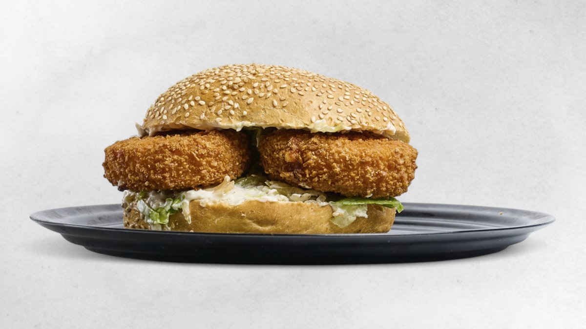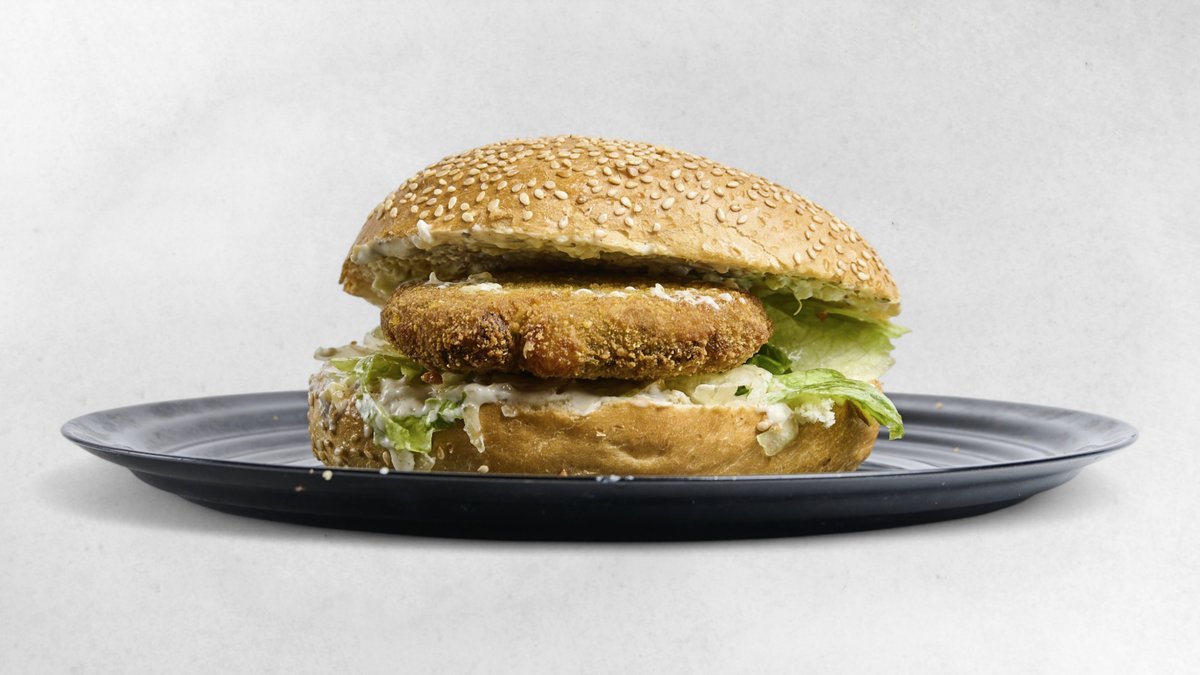 75g Sesam Burger-Brötchen, gebackener Brokkoli-Käselaibchen, Tatarsoße, Salat