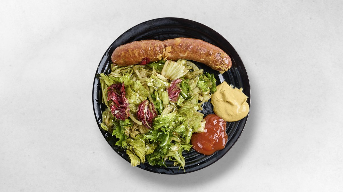Käsekrainer-Puten, Pommes, Ketchup, Senf