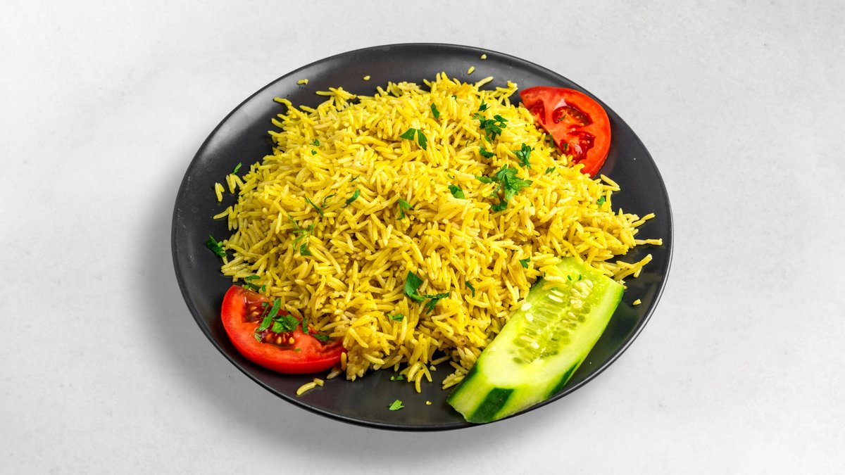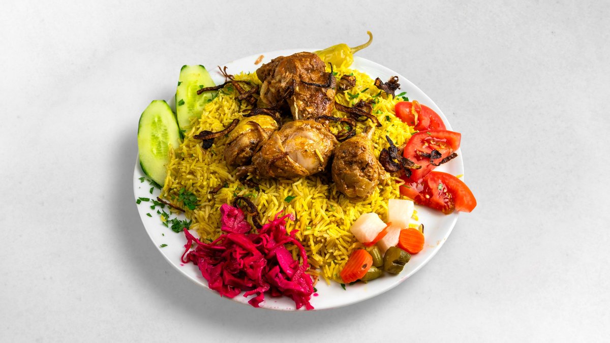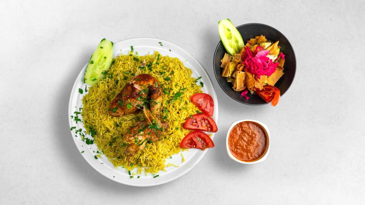 Gewürzte Reise, Hühnerfleisch, Salat und Dakussoße